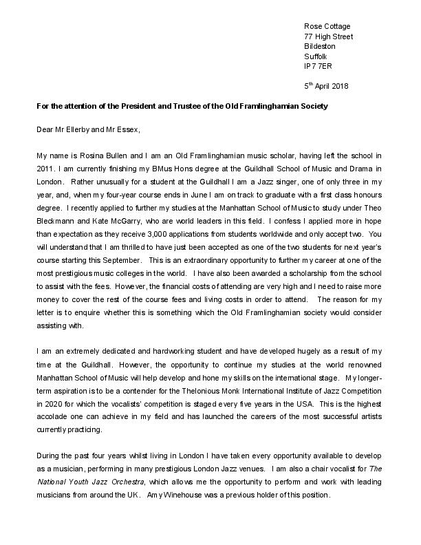 We are delighted to announce that the SOF have agreed to provide £1000 per year for each of the 2 years of the course. Read her fascinating letter for more details on her ambitions and the financial and other challenges she faces - these include her visa not allowing her to work outside the campus for at least the first year. If you believe you could help Rosina in any way then please get in touch with the Trustees via email at trustees@oldframlinghamian.com