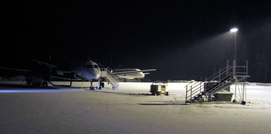 From January to October 2008 Simon did five tours of duty in Sweden flying miners and their families to Swedish Lapland with a return each day. He has included a photograph of his aircraft, taken at 5.30am at -35C.